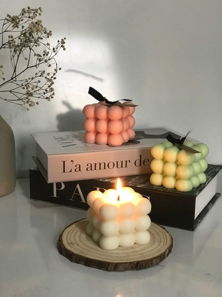 شمع مدرن با فرم مستطیلی و تزئینات حبابی، انتخابی مینیمال و متفاوت برای علاقه‌مندان به طراحی خاص.